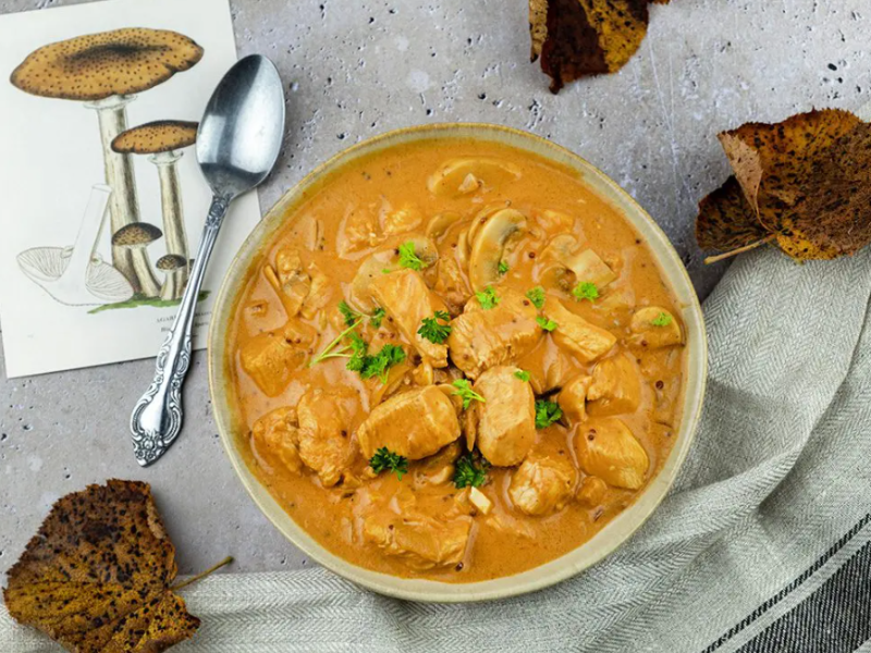 600 gr Kipfilet in blokjes, 350 gr Champignons (of rode/groene paprika), 1 stuks Ui, 2 teentjes Knoflook, 200 ml Slagroom, 1 blikje Tomatenpuree, 1 el Mosterd, 1 el Curryketchup, 1 el Maïzena, 1 tl Worchestershiresaus, 1 glas Rode port, 2 stuks Laurier bladeren, 1 blokje Kippenbouillon, 1 tl Nootmuskaat